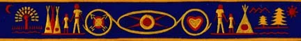 The central theme of the headband is the sign of the eye of the Great Spirit, with the crossed arrows of friendship on the left side and the circled heart of love on the right side. The symbols for father and daughter are next to the grouped tepees, which indicate happy work in the community, and a single teepee, which denotes happy work in the home. The trees, water, and grass exhort the wearer to see and preserve The Great Spirit’s beauty in forest, field, and stream.